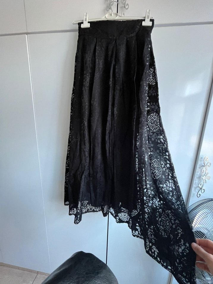 Siyah renkli, tül kumaştan yapılmış bol kesim uzun etek. 38 bedene uygun sıfır ürün etiketi yok sadece denerken zincirin yan kısmında ufak bir deforme oluştu kullanıma engel değildir alana şimdiden hayırlı olsun