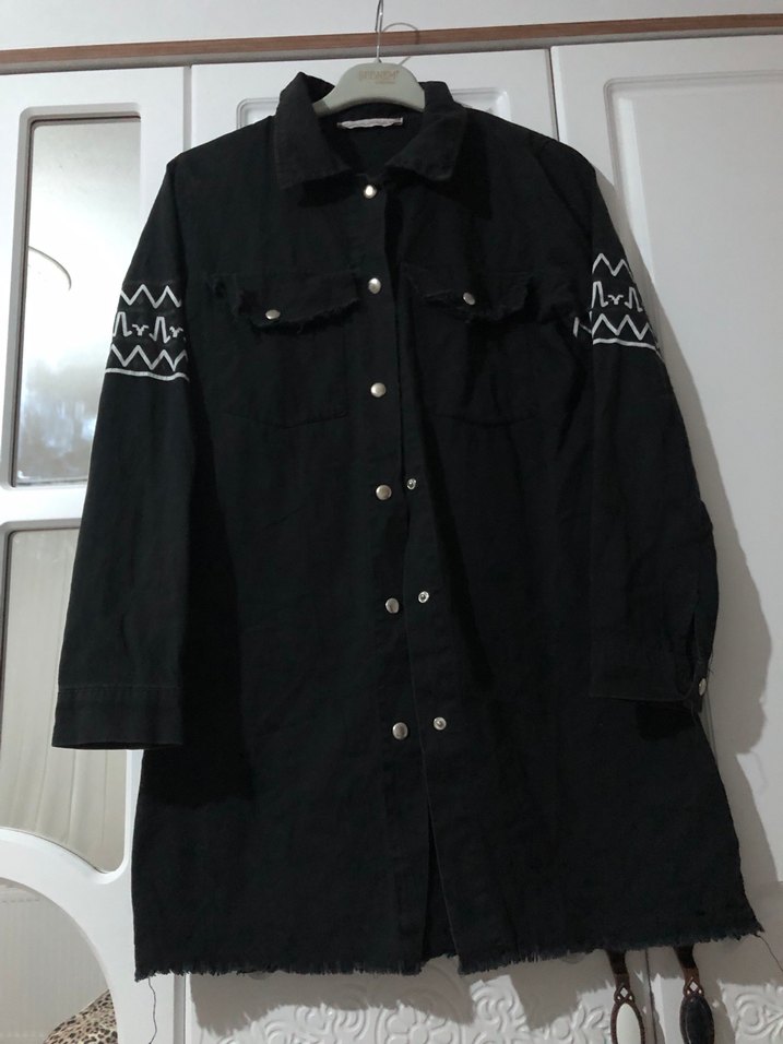 Siyah uzun kot ceket, düğmeli ve kollarda nakış detaylıdır. Notlu yaka ve bol kesimle sokak stiline uygundur.
