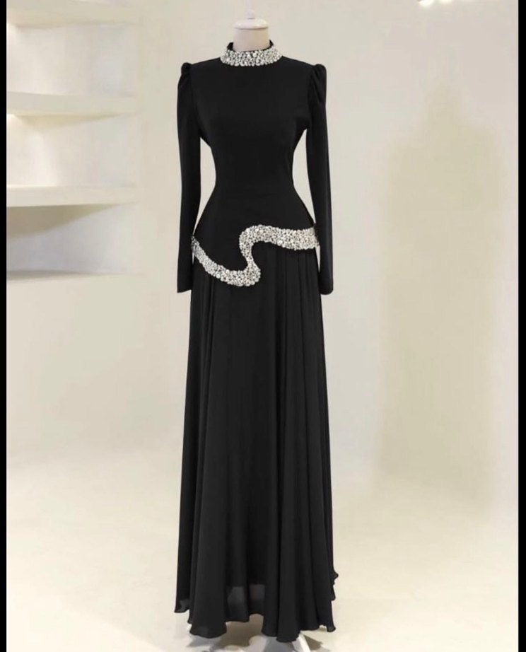 Siyah Nakışlı Uzun Kollu Abiye Elbise Modazehra