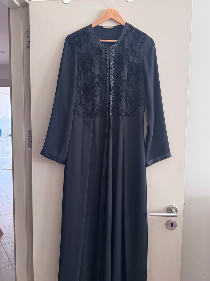Siyah uzun elbise, yüksek yakalı ve uzun kolludur. Nakışlı, ipeksi kumaş ve bol kesimli ferace