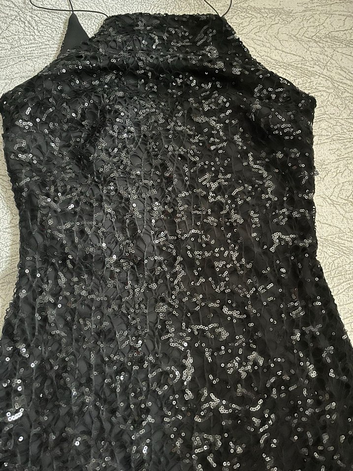 Siyah, uzun ve kolsuz bu abiye elbise, yüksek yakalı ve drapeli detaylara sahiptir. Nakışlı deseni ile gotik parti tarzına uygundur.