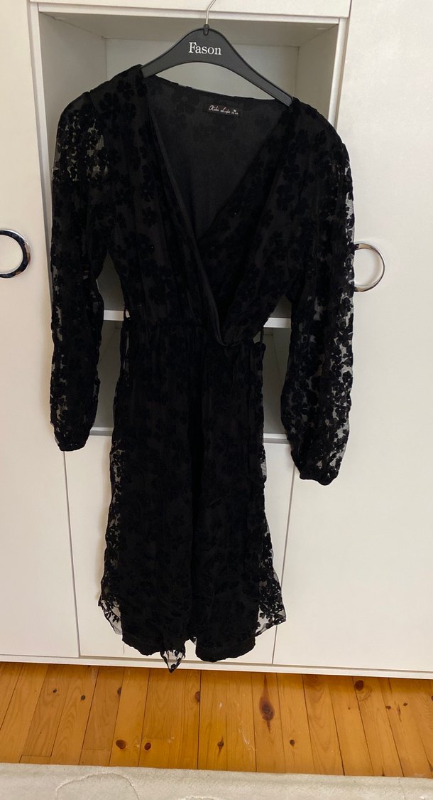 Siyah, uzun kollu ve nakışlı detaylara sahip, gotik tarzda dar kesim uzun elbise.