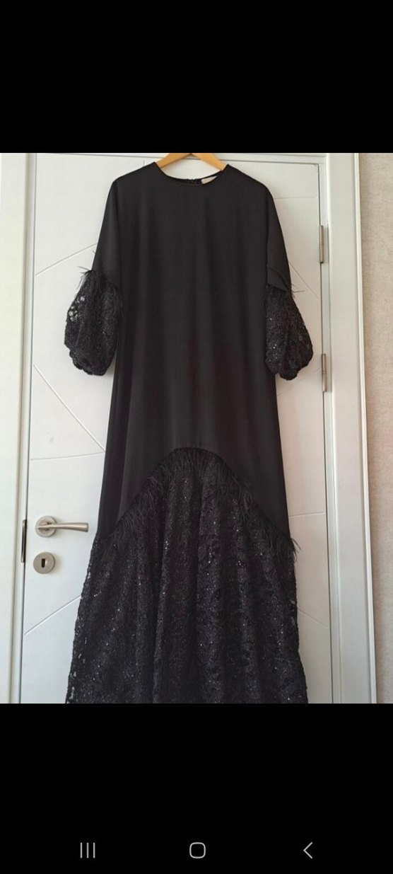 Siyah uzun kollu elbise, nakışlı ve fırfırlı detaylara sahip, bol kesim ve yuvarlak yakalıdır. Gotik tarzda, özel davetler için uygundur.