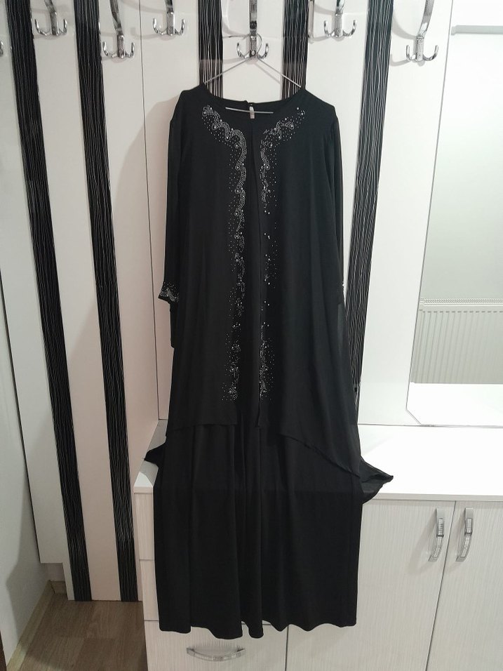 Siyah uzun kollu, nakış detaylı, bol kesim ve drapeli gotik tarzda günlük kullanıma uygun uzun elbisedir.