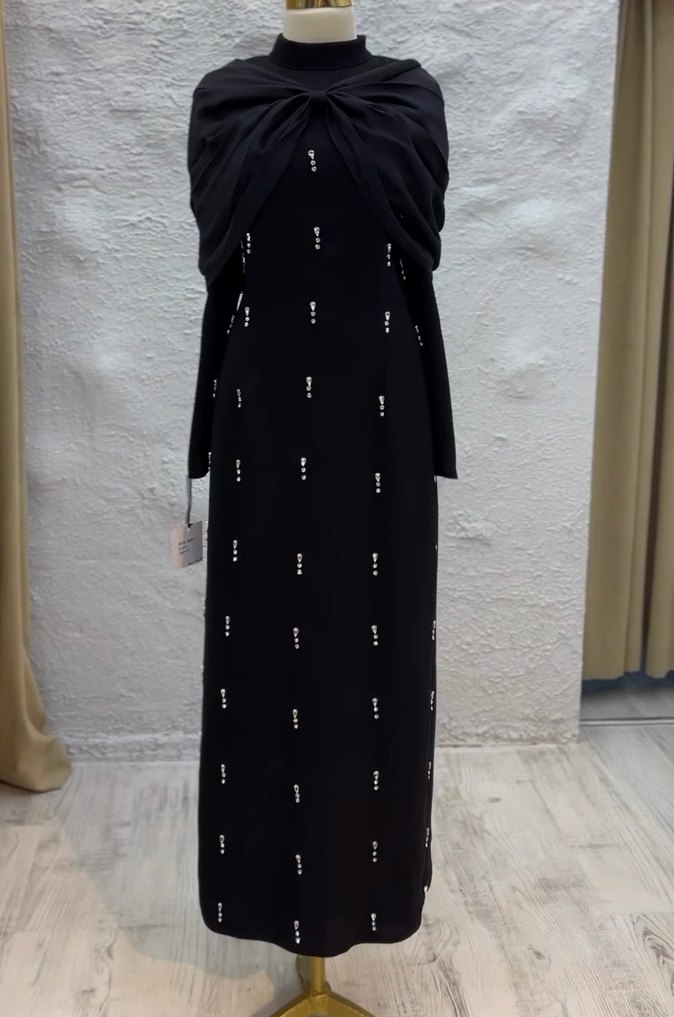 38-40 BEDENE OLUR 60 KİLOYA KADAR OLUR Siyah, yüksek yakalı ve uzun kollu nakışlı uzun elbise. Düzenli kesim ve drapeli tarzda, günlük kullanıma uygun avangart gotik stil. Sentetik kumaştan.