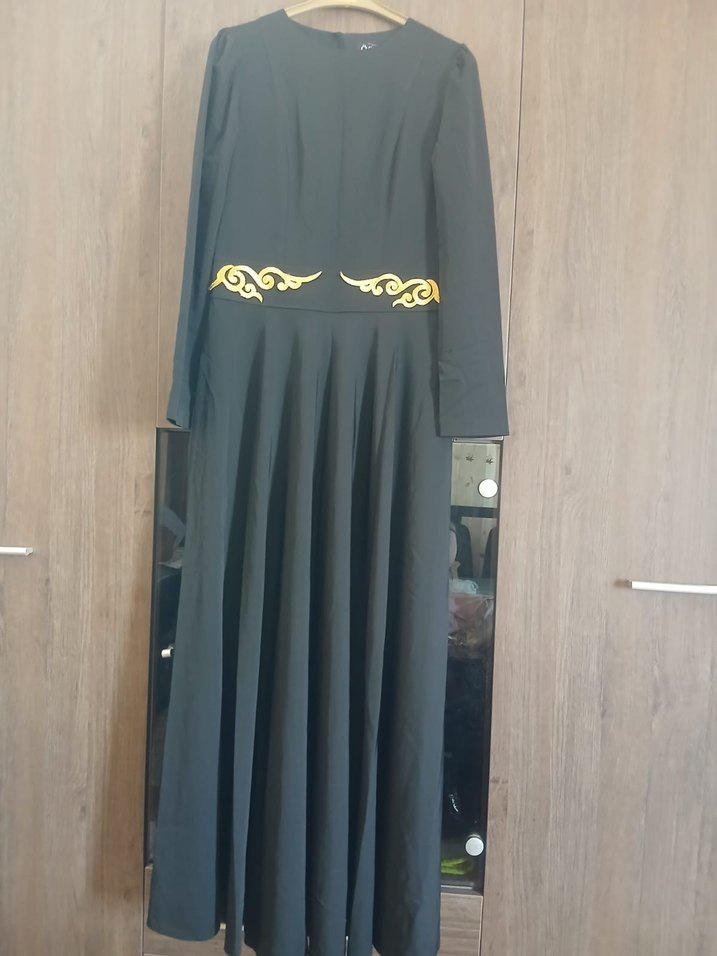 Siyah renkte, uzun kollu ve yuvarlak yakalı, nakış detaylı bel kısmı bulunan kadın elbisesi. Sorunu yok Düğünde sadece bir kez giyildi