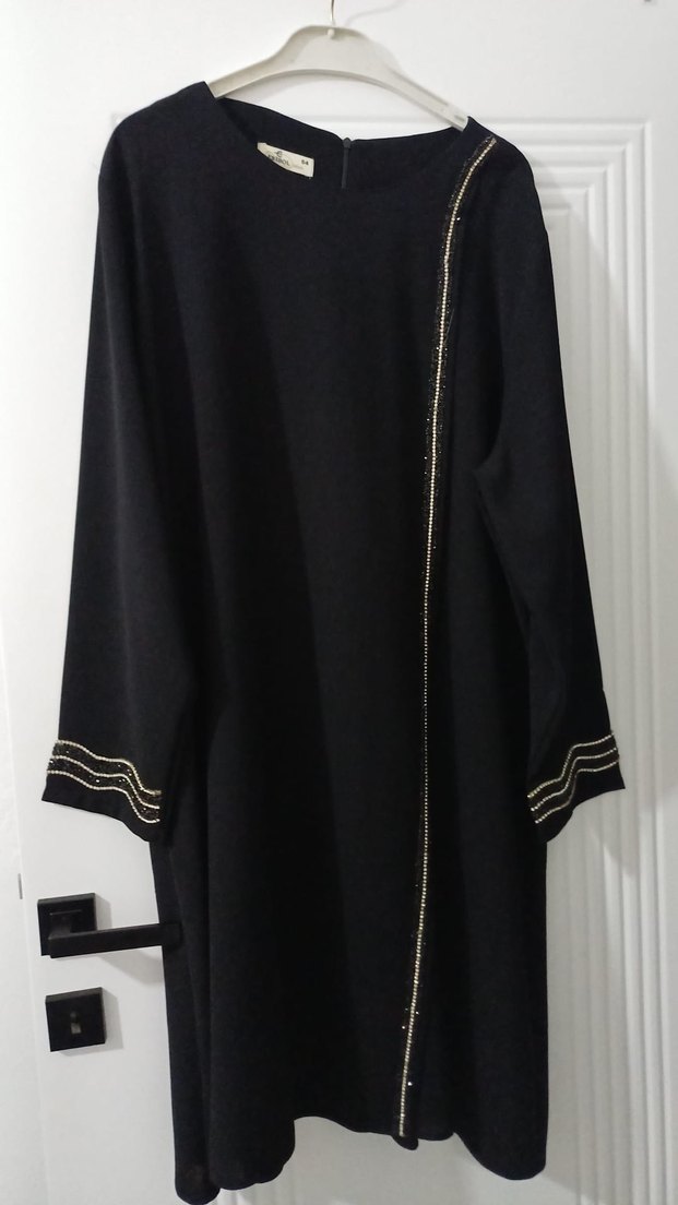 Saten dokulu, siyah uzun elbise yüksek yakalı ve uzun kolludur. Ön ve kol uçlarında nakış detayları vardır. Ofis için uygun, klasik ve modest kesimdir. ✨