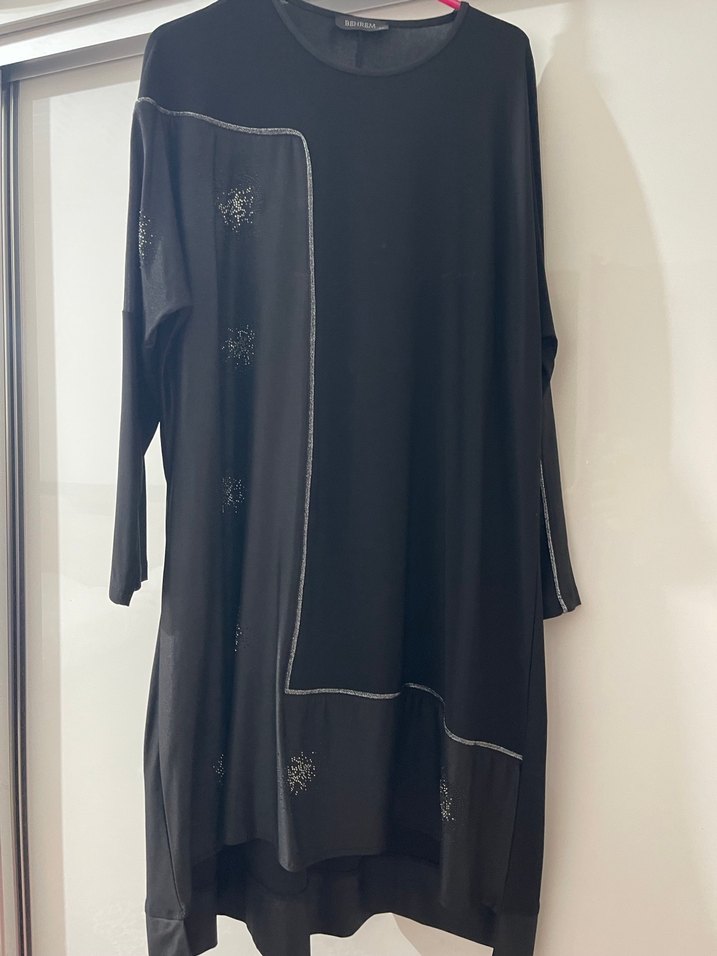 Siyah renkte, nakış detaylı, uzun kollu ve bol kesim kadın tunik. Sentetik kumaştan üretilmiş, yuvarlak yaka ve dökümlü tasarıma sahip, çağdaş ve avangart stil sunar.