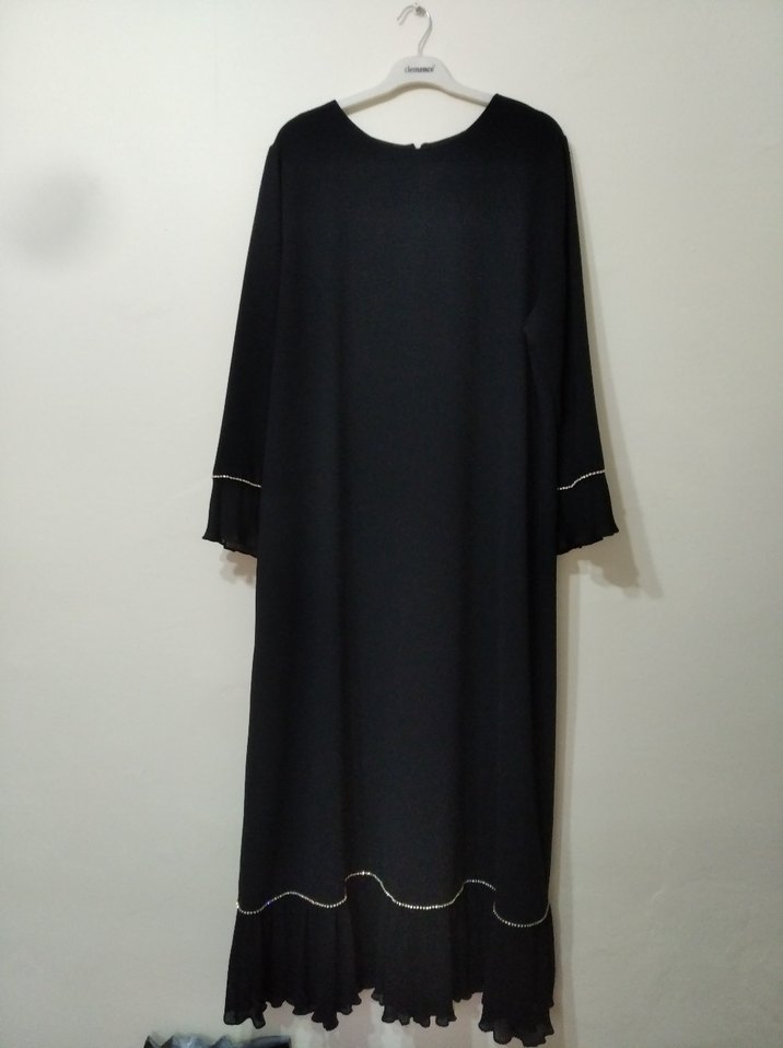 Siyah renkli, nakışlı detaylara sahip uzun kollu, salaş kesim elbise. Yumuşak sentetik kumaştan üretilmiştir, günlük kullanım için uygundur.