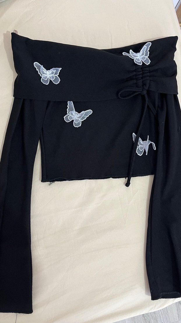 Siyah, nakışlı kelebek detaylı, uzun kollu, straplez ve kemerli, vücuda oturan gotik tarzda bluz.