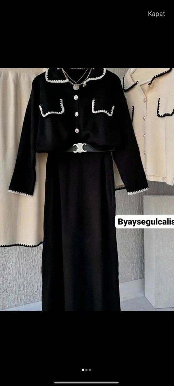 Siyah uzun kollu, yakalı ve nakış detaylı etek takım . Bel kemeri ile klasik ve şık bir duruş sunar, ofis için uygundur.