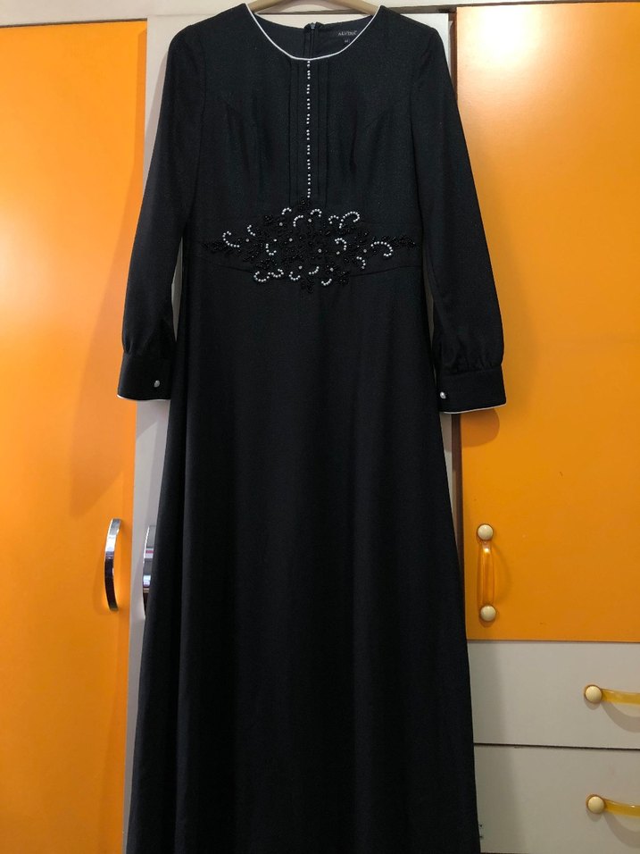 Siyah uzun elbise, uzun kollu ve çentikli yaka detayına sahiptir. Nakışlı ve drapeli tasarımıyla ofis için uygundur. Sentetik kumaştan üretilmiştir. 38-40 bedene uyumludur 1.60 boy 62 kilo ile rahat giyildi