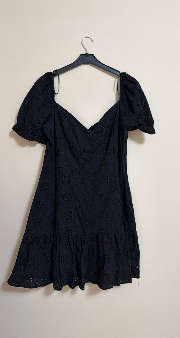 Siyah mini elbise, V yaka ve bol kesimdir. İp askılı ve balon kolludur. Nakış desenleri ve fırfır detayları vardır, romantik akşamlar için uygundur.