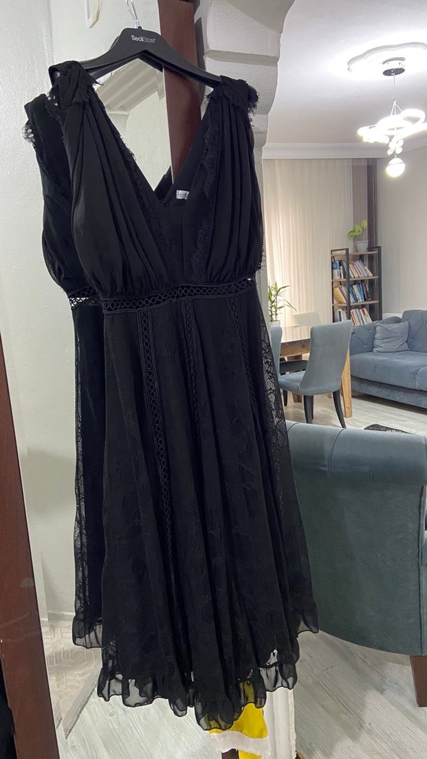 Siyah uzun elbise, drapeli V yakalı ve askılı kollu, ipeksi kumaştan nakış detaylıdır. Gevşek kesim, klasik gotik şıklığı yansıtır, romantik akşamlar için uygundur.