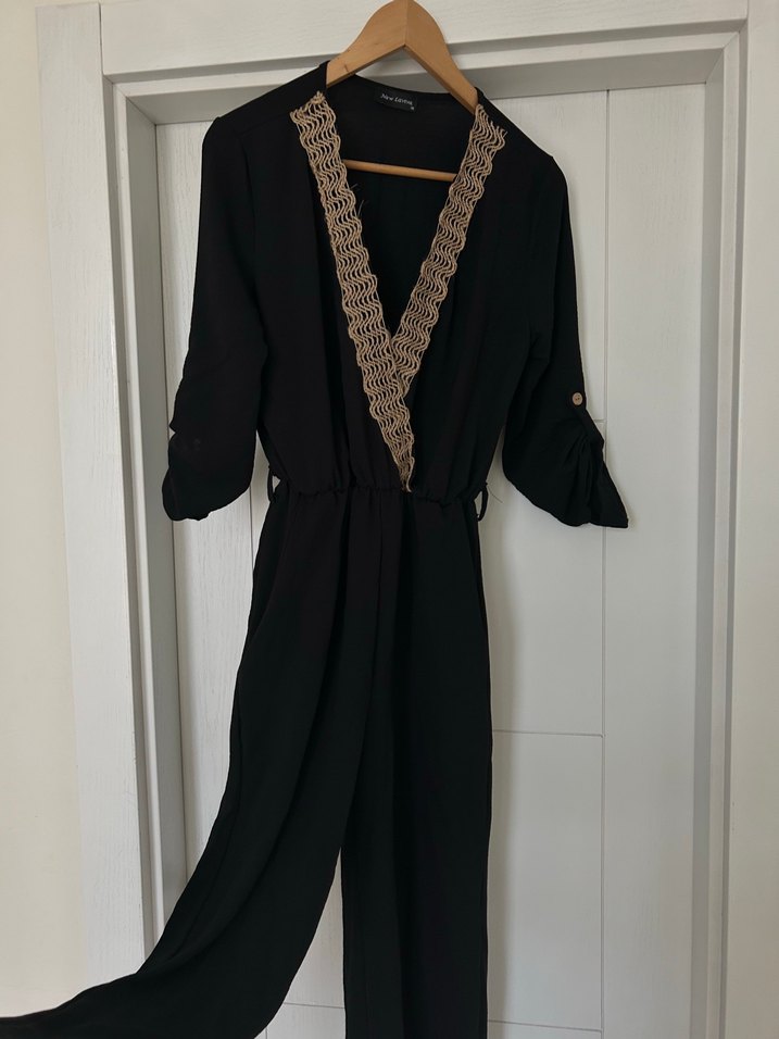Siyah uzun tulum, zincir detaylı V yakaya ve nakışlı desene sahiptir. İpek gibi kumaştan, bol kesim ve askılı kolludur. Ofis için klasik bohem tarzda.