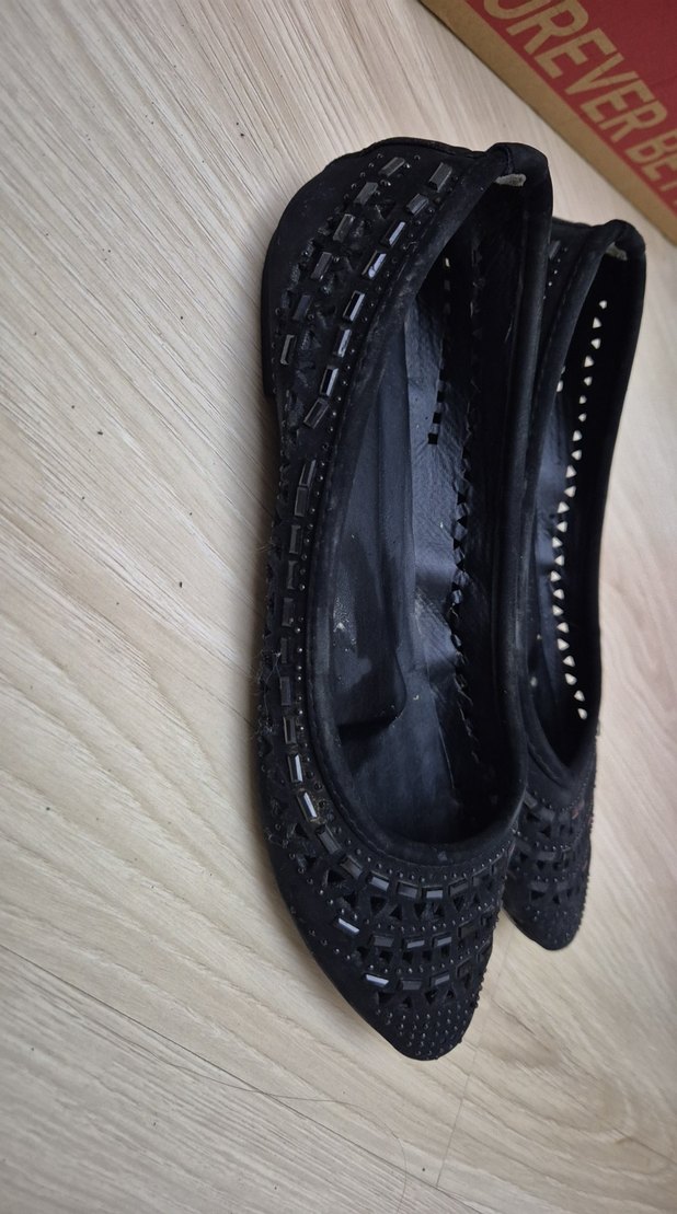 Nakışlı desenler ve boncuk detayları ile siyah dolgu topuklu kauçuk babet, günlük kullanıma uygun gotik tarzda.