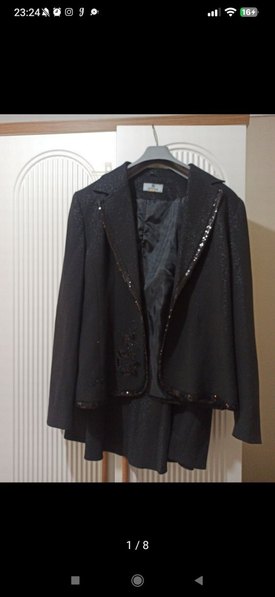 Siyah, uzun kollu, yakalı ve nakışlı detaylara sahip, düğmeli sentetik kumaş kadın ceket ve etek. Abiye