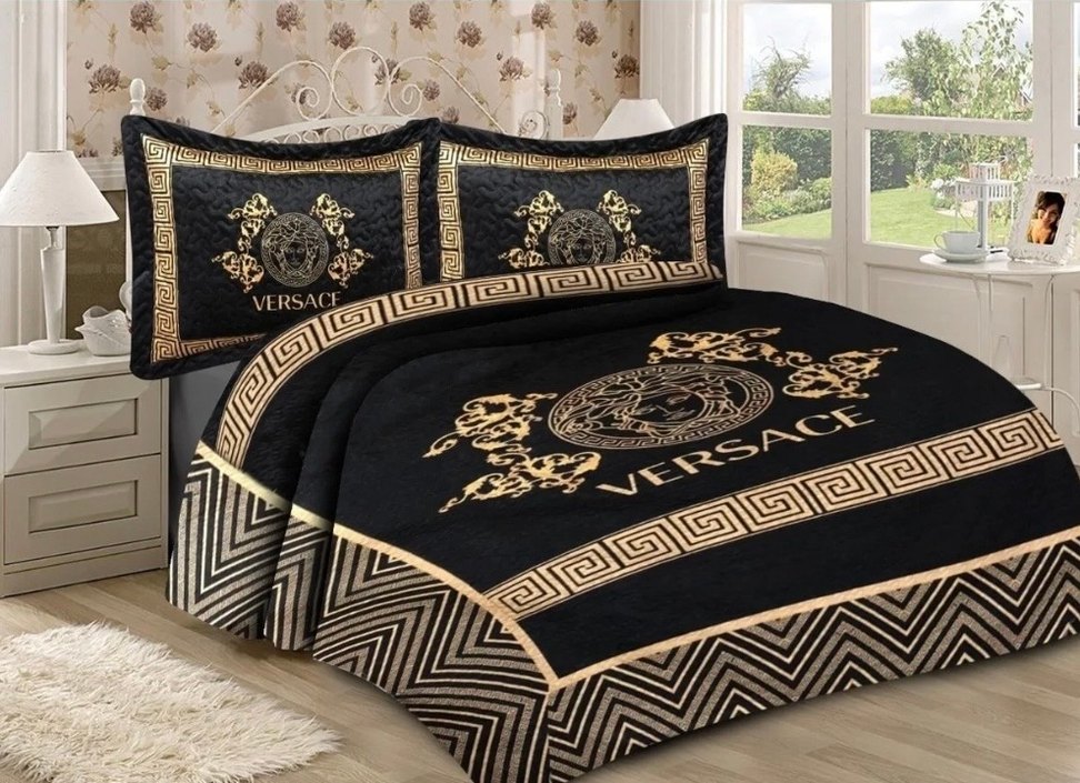 Siyah renkte, Versace logosu ve detaylı nakış desenleriyle Nakışlı yastık kılıfları dahildir yorgan kadar olmasa da çok kalın bir yatak örtüsü seti, hediye geldi kullanılmadı çünkü benim yatak odamda hiç gold detay yokk