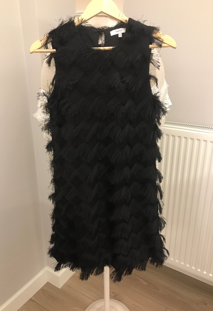 Siyah nakışlı volan detaylı, kolsuz ve straplez midi elbise. Rahat kesimiyle parti için uygun, gotik ve Paris tarzı avant-garde bir tasarım. Çok rahat çok şık bir elbise , 1 kere giyildi , arkadan düğmeli mini elbise