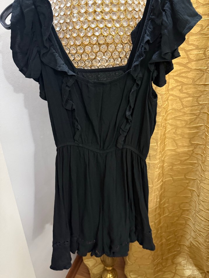 Siyah renkte, nakışlı ve volan detaylı, V yaka ve kolsuz elbise Rahat kesimi ve yaz için uygundur. S Xs uyumludur