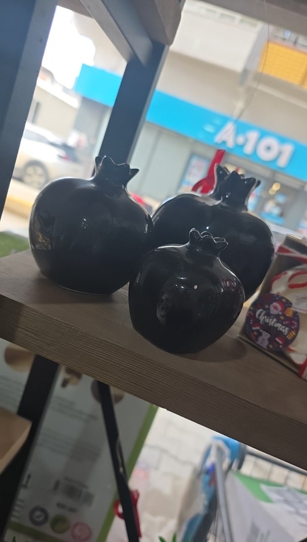 Parlak yüzeye sahip üç farklı boyutta siyah nar figürlerinden oluşan dekoratif set.