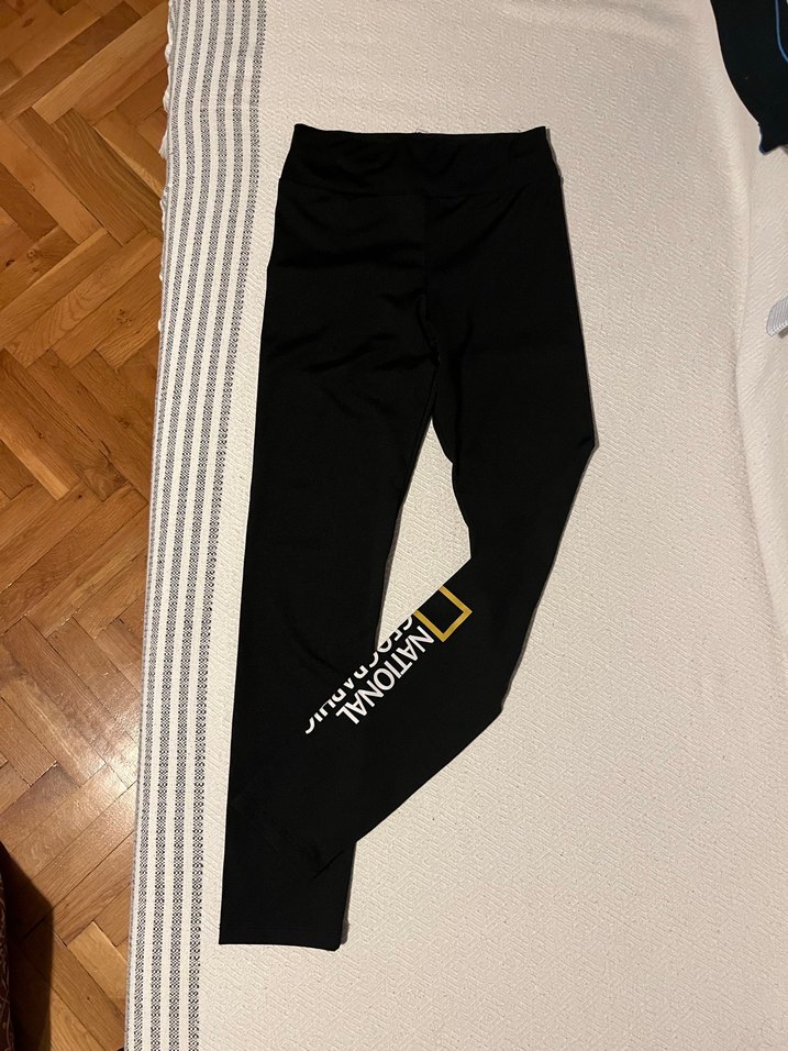 Siyah, sentetik kumaştan yapılmış, bacakta National Geographic logosu bulunan, oturan spor tayt. Spor ve günlük sokak stili için uygundur.