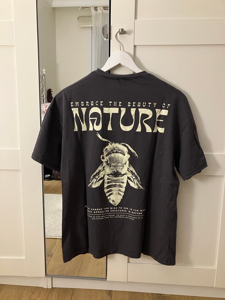 Antrasit renkli, nature temalı baskılı t-shirt. Günlük, sadece yaka dikişi biraz kibar değil, ama giyince göze batmıyor. Ben iki kez belki giydim. Çok kıyafetim var bu yüzden satıyorum