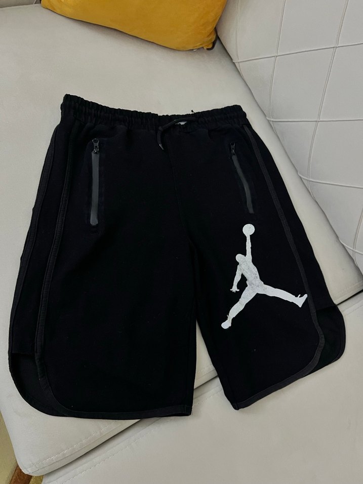 Yumuşak ve sıcak kumaştan, fermuarlı cepleri olan siyah mini boy, bol kesim erkek şortu. Yanında beyaz basketbol logosu bulunur. baskısında az bi soyulma var