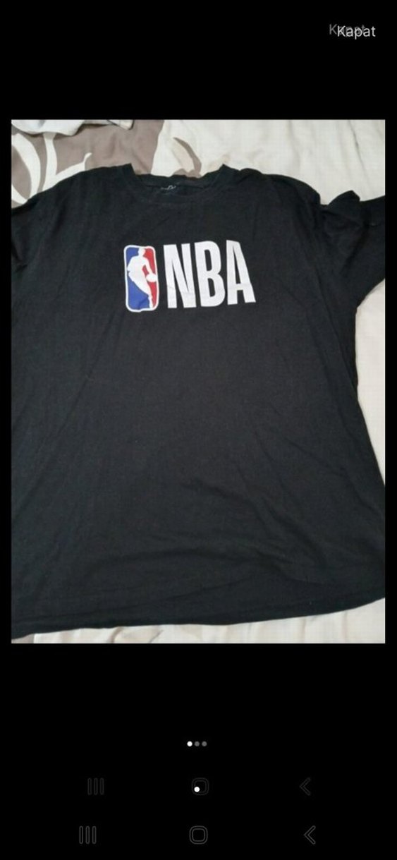 Siyah kısa kollu erkek tişörtü, bol kesim ve yuvarlak yakaya sahip, önünde belirgin NBA baskısı bulunur. Spor ve günlük kullanıma uygundur.