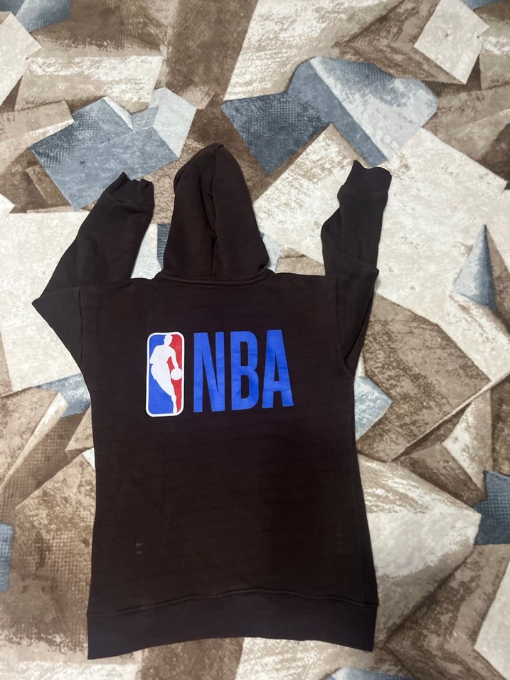 Siyah, fermuarlı ve kapüşonlu, yumuşak dokulu kumaştan üretilmiş, uzun kollu ve sırtında NBA baskısı bulunan dar kesim sweatshirt.