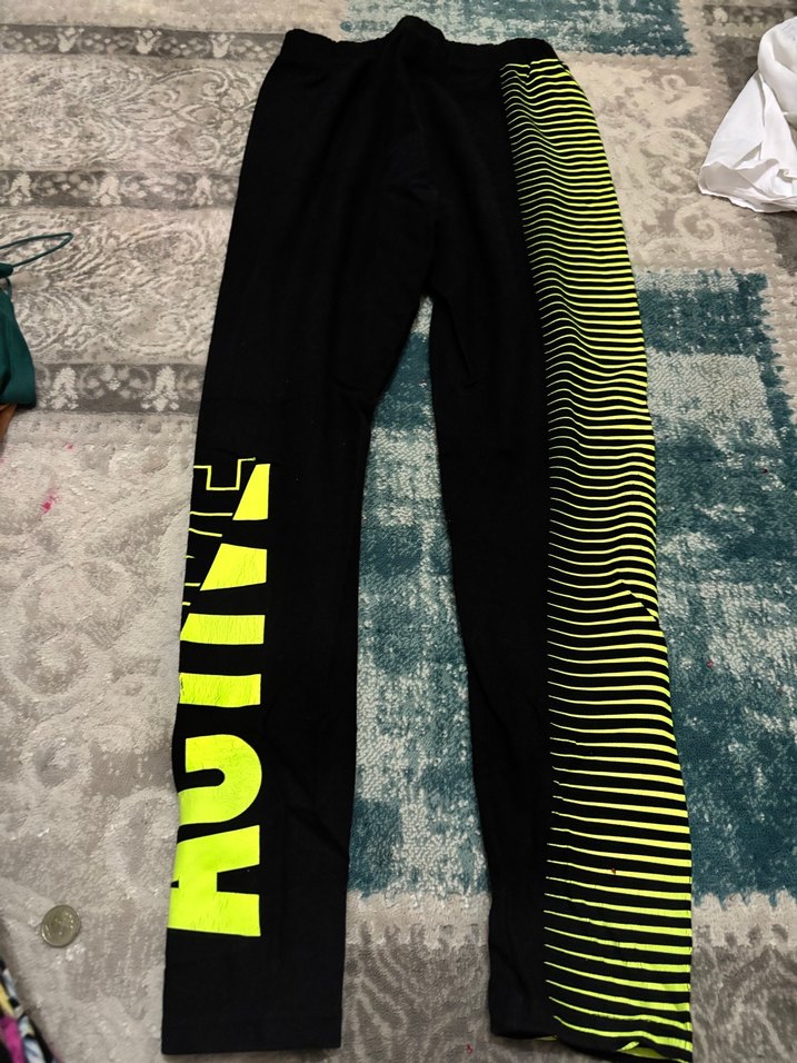 Siyah taban üzerine neon sarı baskılı, elastik bel lastikli, spor ve günlük kullanıma uygun kadın tayt.