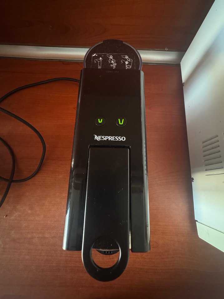 Siyah renkli Nespresso kahve makinesi, kompakt tasarım ve kolay espresso hazırlama için basit düğme kontrollerine sahiptir. ☕