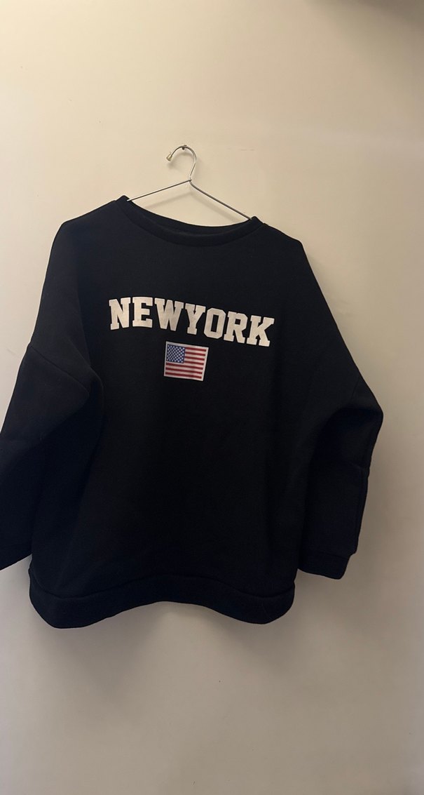 Siyah, uzun kollu, yuvarlak yaka, bol kesim sweatshirt. Önünde New York yazısı ve Amerikan bayrağı baskısı bulunur. Rahat ve sıcak kumaştan üretilmiştir.