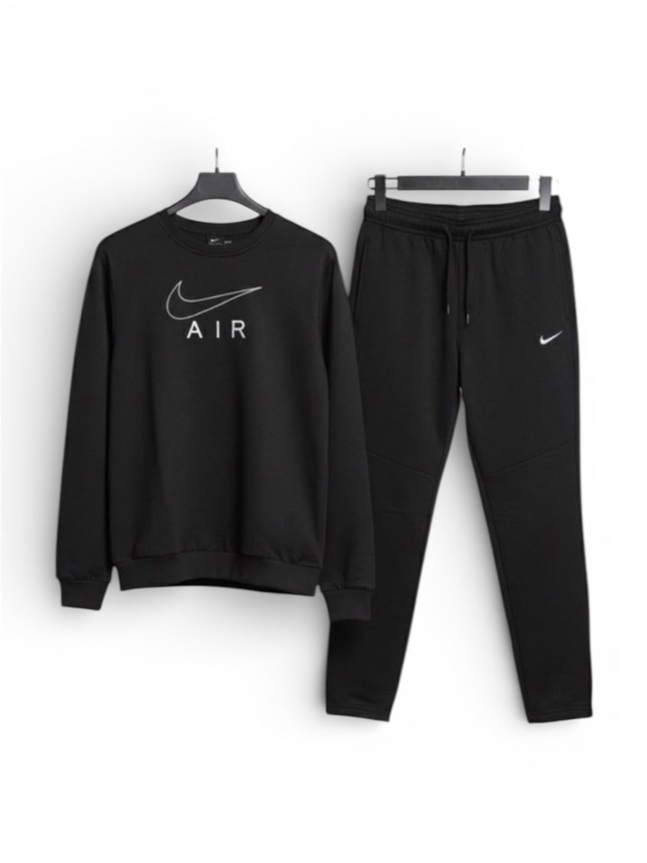 Siyah Nike Air eşofman takımı, rahat kesim, bisiklet yaka sweatshirt ve jogger pantolondan oluşur. Düz tasarımı yumuşak ve sıcak kumaştan, günlük sokak stili için uygundur.