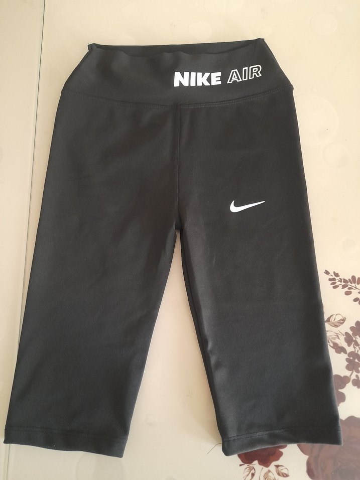 Siyah, elastik bel bantlı Nike Air kadın taytı, midi boyda, spor ve günlük kullanıma uygun, yumuşak sentetik kumaştan üretilmiştir.
