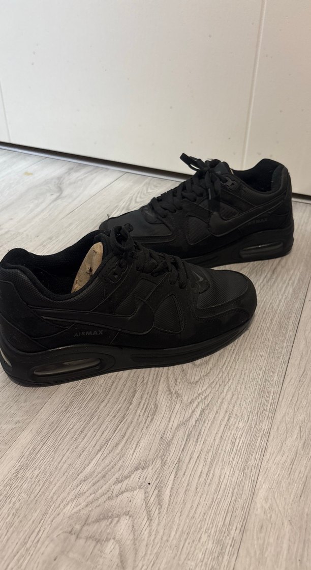 Siyah bağcıklı kadın spor ayakkabısı, kauçuk tabanlı, şık sokak stili ve ince topuklu tasarıma sahip. Spor aktiviteleri için uygun. İç ve dış kısımda yıpranma ve açılma yoktur. Air tabanı sağlam, herhangi bir çökme yok.