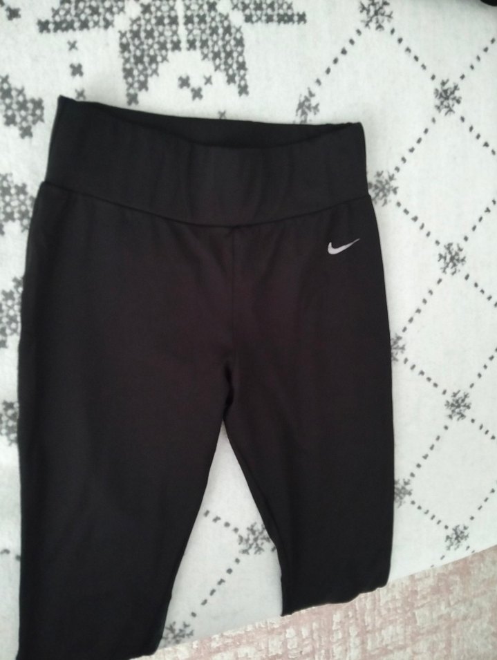 Siyah, elastik bel bantlı, sentetik kumaştan Nike markalı bilek boyu tayt. dizaltıdan itibaren yanlarda ve arkada tül detayları var.spor ve günlük sokak tarzı için uygundur.