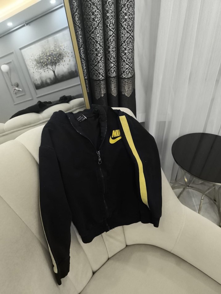 Siyah renk, fermuarlı ve baskılı sarı şerit detaylı Nike erkek çocuk sweatshirtü, yumuşak ve sıcak kumaştan üretilmiştir, bisiklet yaka ve dar kesimlidir. orginal deil