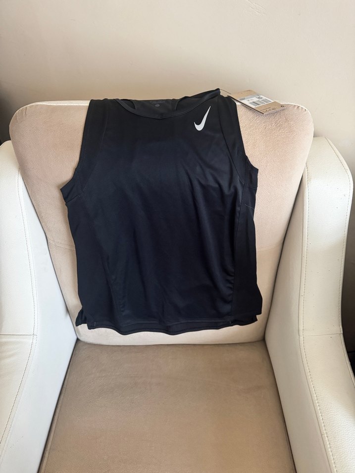 Siyah renkli, Nike markalı, düz ve kolsuz kadın atlet. Dar kesim ve yuvarlak yaka ile spor ve şık bir görünüm sunar.