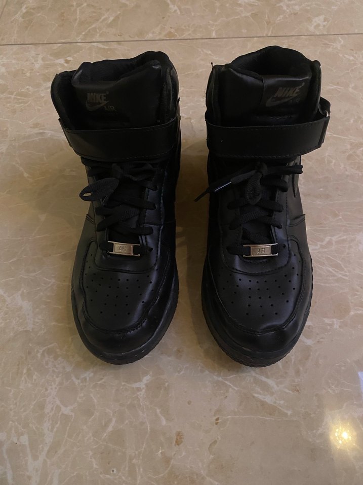 Siyah Nike kadın erkek spor ayakkabısı, ince topuklu ve tokalıdır. Kauçuk malzemeden yapılmış, sportif sokak tarzı için uygundur.