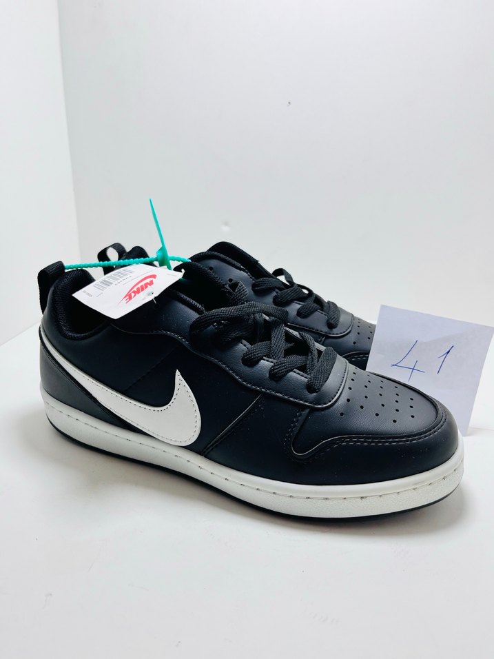 Siyah renkli Nike kadın spor ayakkabısı, bağcıklı ve baskılı desenlidir. İnce topuklu ve beyaz tabanlı, spor ve sokak stili karışımıdır.