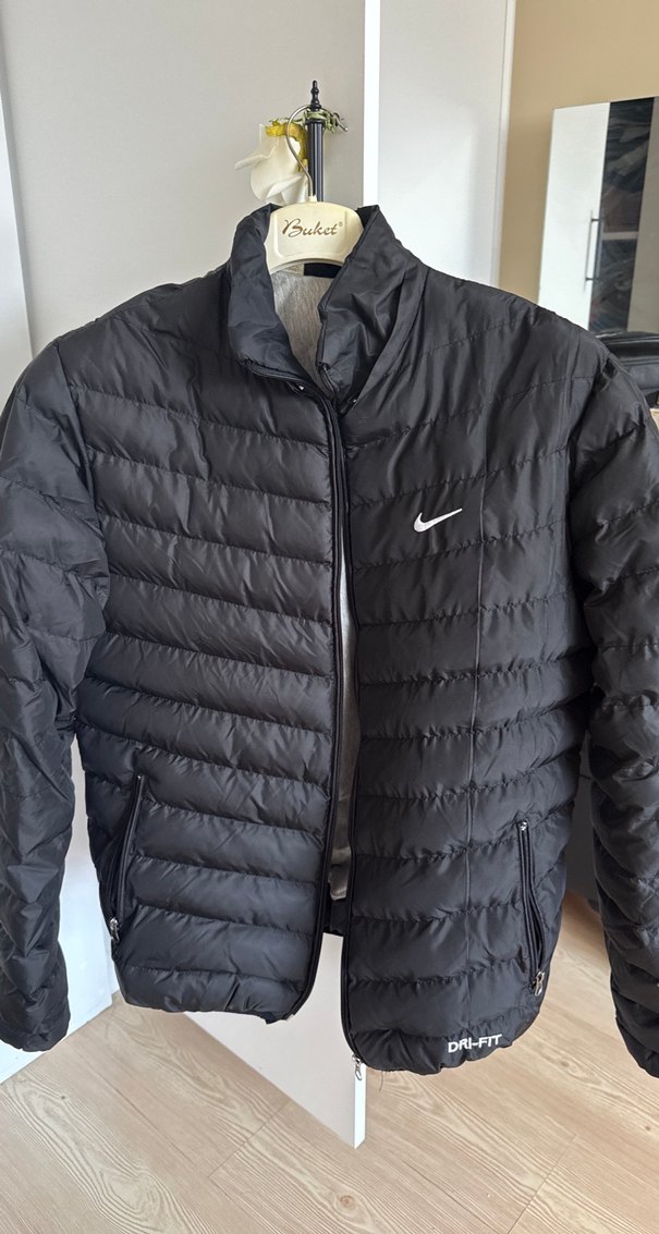 Fitted siyah Nike kışlık mont, fermuarlı ön, uzun kollu ve kesik yakalıdır. Yumuşak, sıcak kumaştan üretilmiş, gündelik sokak giyimine uygundur.