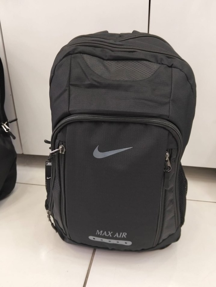 Nike marka siyah Max Air baskılı, çok bölmeli fermuarlı sırt çantası. Sokak stili için uygun, MAXAIR logosu bulunur.