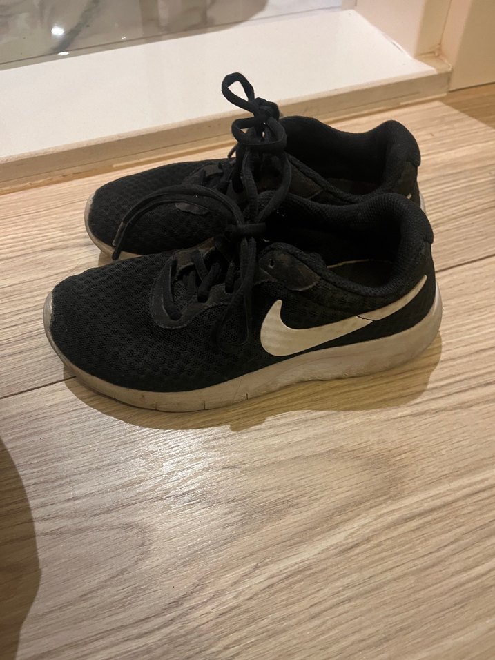 Düz siyah Nike spor ayakkabısı, lastik tabanlı ve bağcıklı. Spor ve sokak stili için uygun, rahat ve sade tasarım.