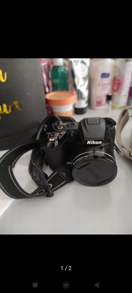 Koyu siyah renkte Nikon dijital fotoğraf makinesi, lens kapağı ve taşıma askısı ile birlikte.