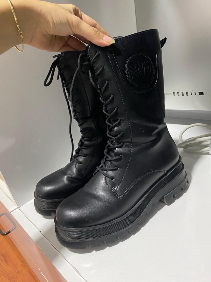 Siyah kauçuk malzemeden yapılmış, gotik tarzda platform topuklu kadın botlarıdır.