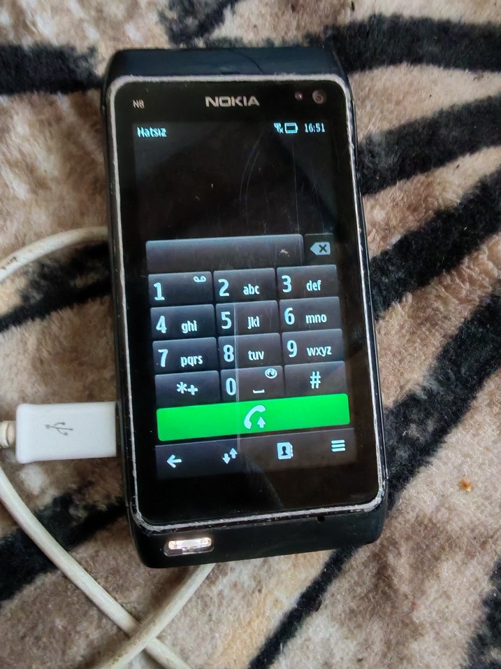 Nokia 1651 model siyah renk dokunmatik ekranlı telefon, sayısal tuş takımı ekranında görünmekte ve şarj kablosuna bağlıdır. Nokıa n8 denenmedi imeili kayıtlı bu şekil iadesiz satış