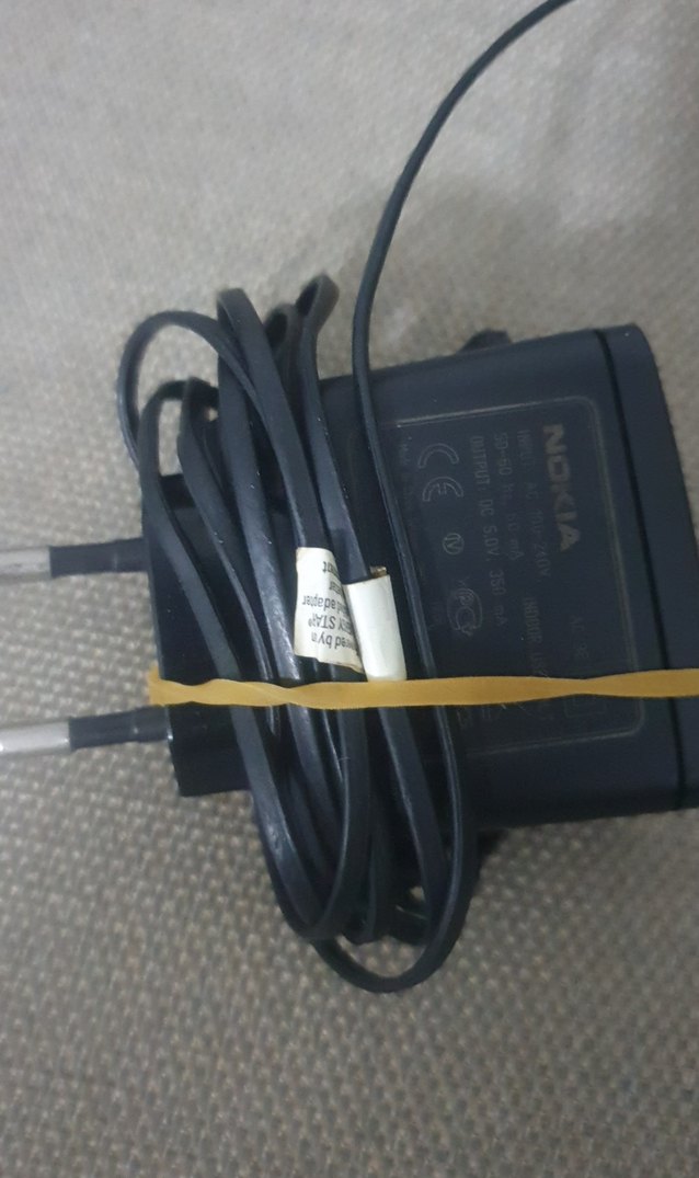 Kompakt tasarımlı siyah Nokia telefon şarj cihazı, uzun kablo kauçuk bantla sabitlenmiş. Nokia cihazlarla uyumludur.