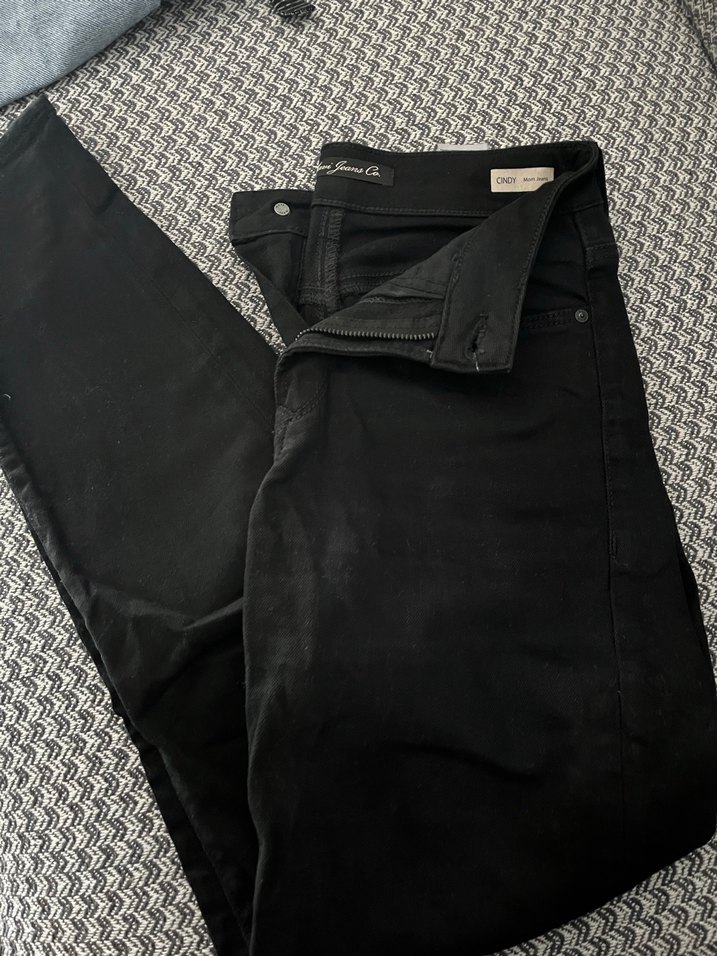Siyah renkli, normal boy ve slim mom fit kadın denim pantolon. Fermuarlı ve sade tarzıyla günlük kullanıma uygundur.