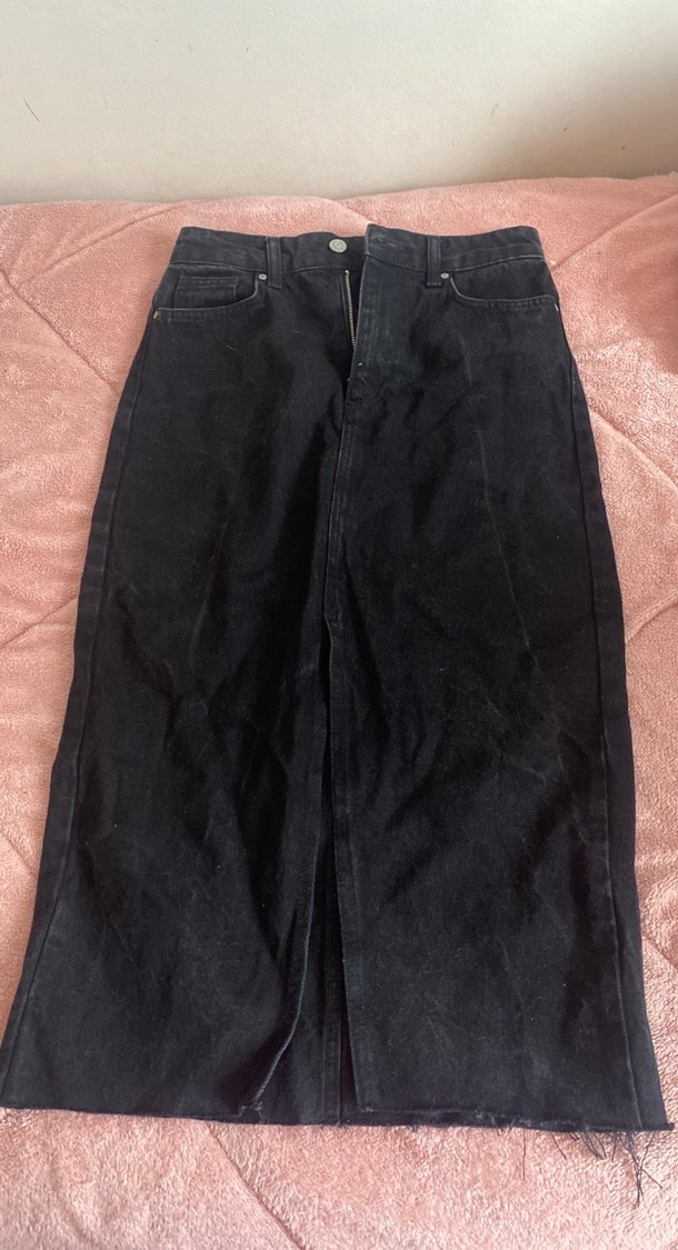 Siyah, normal boy, dar kesim denim etek, desensiz ve günlük kullanıma uygun. Rahat ve şık bir görünüm sunar. 34 beden Trendyol marka siyah önden yırtmaçlı kot uzun etek